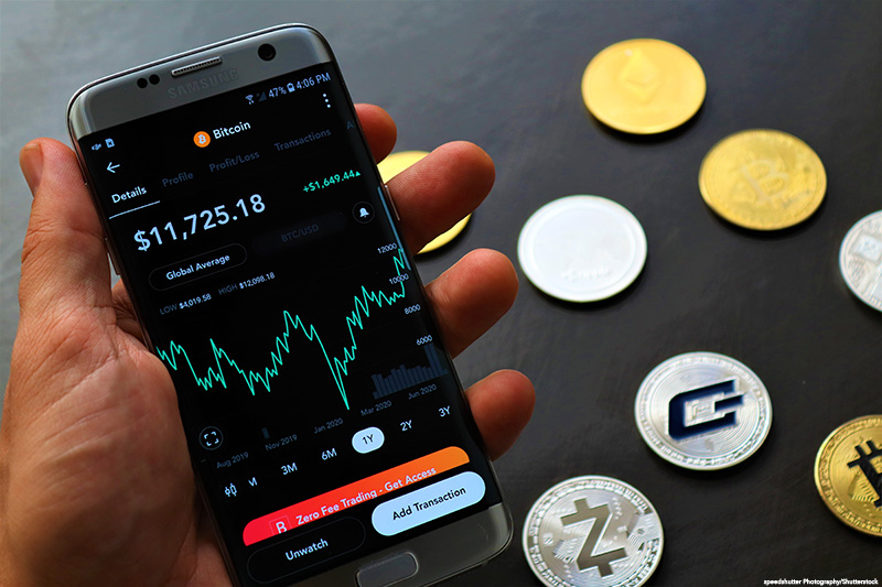 Cryptocurrency app with coins on a dark background.