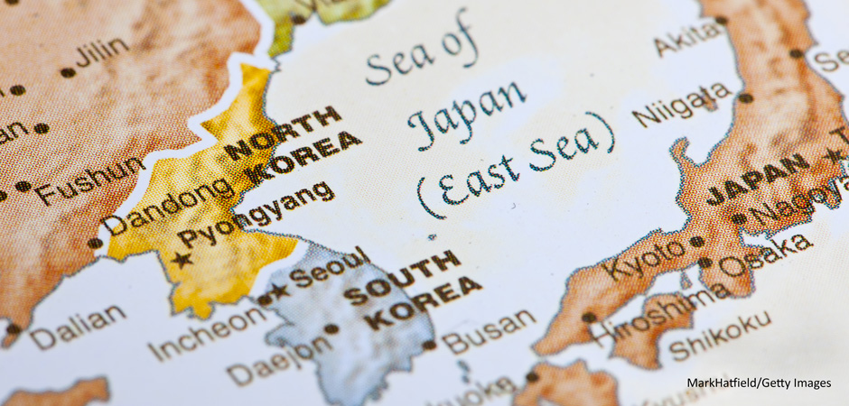 Detailed close-up view of a world map showing North Korea, South Korea, and Japan.