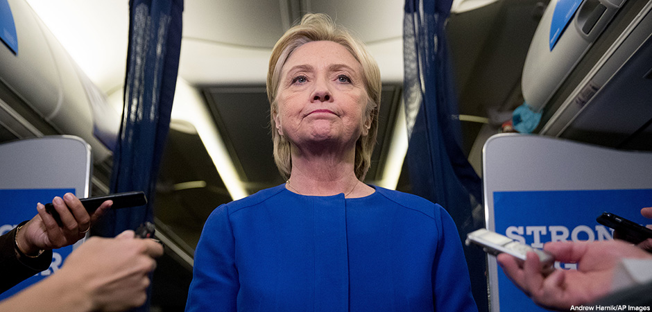 Democratic presidential candidate Hillary Clinton pauses while she gives remarks on the explosion in Manhattan’s Chelsea neighborhood onboard her campaign plane at Westchester County Airport, in White Plains, N.Y., Saturday, Sept. 17, 2016,