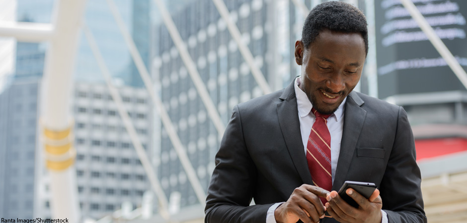Young happy African businessman using mobile phone in front of modern building at Bangkok city; Shutterstock ID 532983730; purchase_order: DAL Enhancement Project; job: TBD/Various; client: Janice Roerig-Blong
