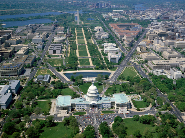 120414_05P_EC Photo Credit: Photographs in the Carol M. Highsmith Archive, Library of Congress, Prints and Photographs Division. Aerial view from above the United States Capitol Building, looking west along the National Mall.