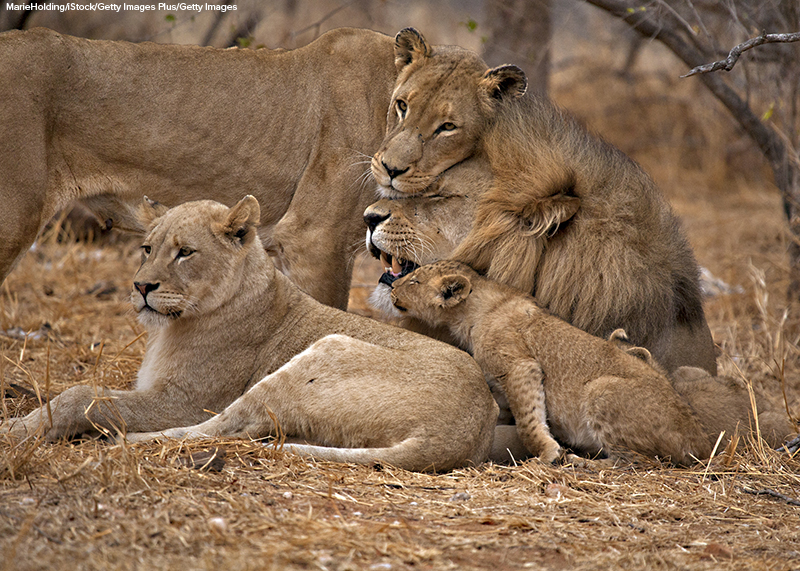 A lion family cuddling in the steppe A group of African lions. Family of Lions in Kruger National Park in South Africa