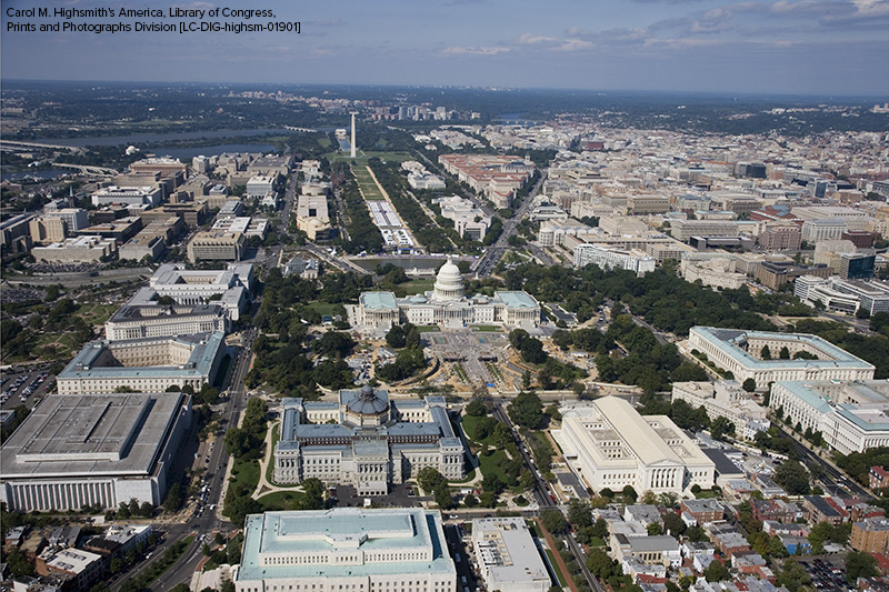 [Aerial view of Washington, D.C., looking west, with Library of Congress Thomas Jefferson Building in center foreground and James Madison Building at left]; 2007; Carol M. Highsmith, photographer