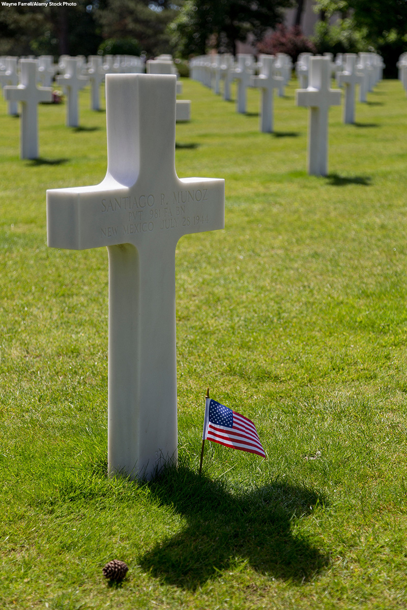 D-Day American Cemetery – White Cross tombstones with American flag at Coleville Cemetary, Omaha Beach, Normandy France