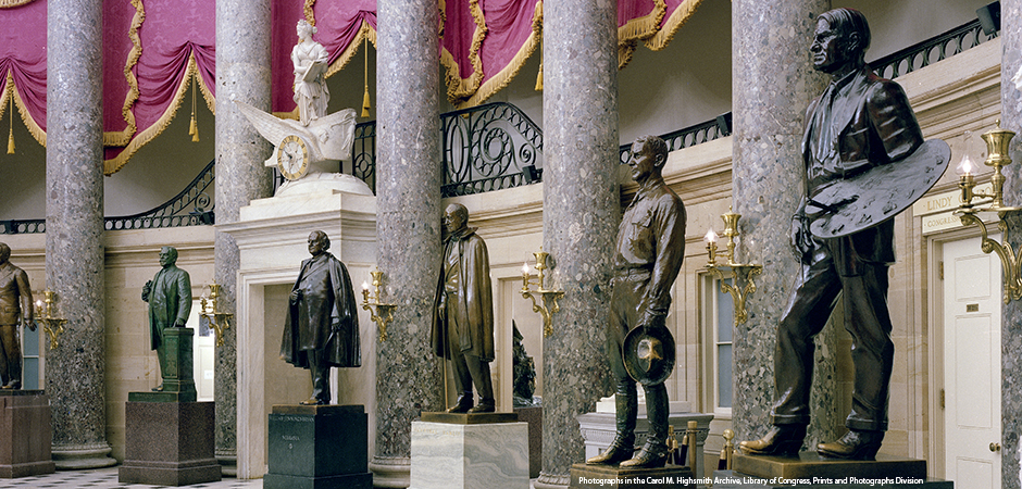 The National Statuary Hall Collection in the United States Capitol is comprised of statues donated by individual states to honor persons notable in their history. The entire collection now consists of 100 statues contributed by 50 states. All 50 states have contributed two statues each. Statues from right to left: Charles Marion Russell (1864-1926), Montana; John Campbell Greenway (1872-1926), Arizona; Hannibal Hamlin (1809-1891), Maine; William Jennings Bryan (1860-1925), Nebraska; William Henry Harrison Beadle (1838-1915), South Dakota. Carol Highsmith, photographer. Photographed: [between 1980 and 2006]. 1 color transparency; 4 x 5 in. or smaller. Forms part of the Selects Series in the Carol M. Highsmith Archive. Gift and purchase; Carol M. Highsmith; 2011; (DLC/PP-2011:124).