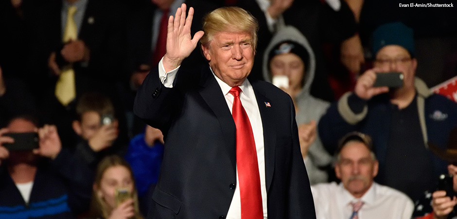 HERSHEY, PA – DECEMBER 15, 2016: President-Elect Donald Trump waves to the crowd as he arrives on stage to deliver a speech at a Thank You tour held at the Giant Center.