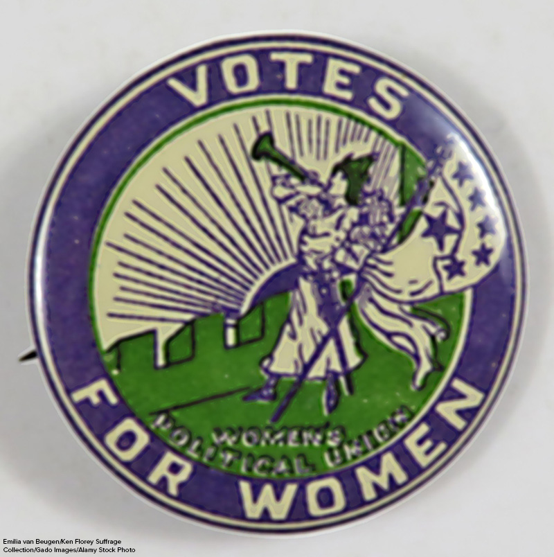 Suffrage-era ‘Clarion’ button with stars, with the text ‘Votes For Women, ‘ and featuring Caroline Watt’s ‘Bugler Girl’ or ‘Clarion Girl’ design, with stars on the flag indicating the number of states with full suffrage rights, printed in purple, green, a