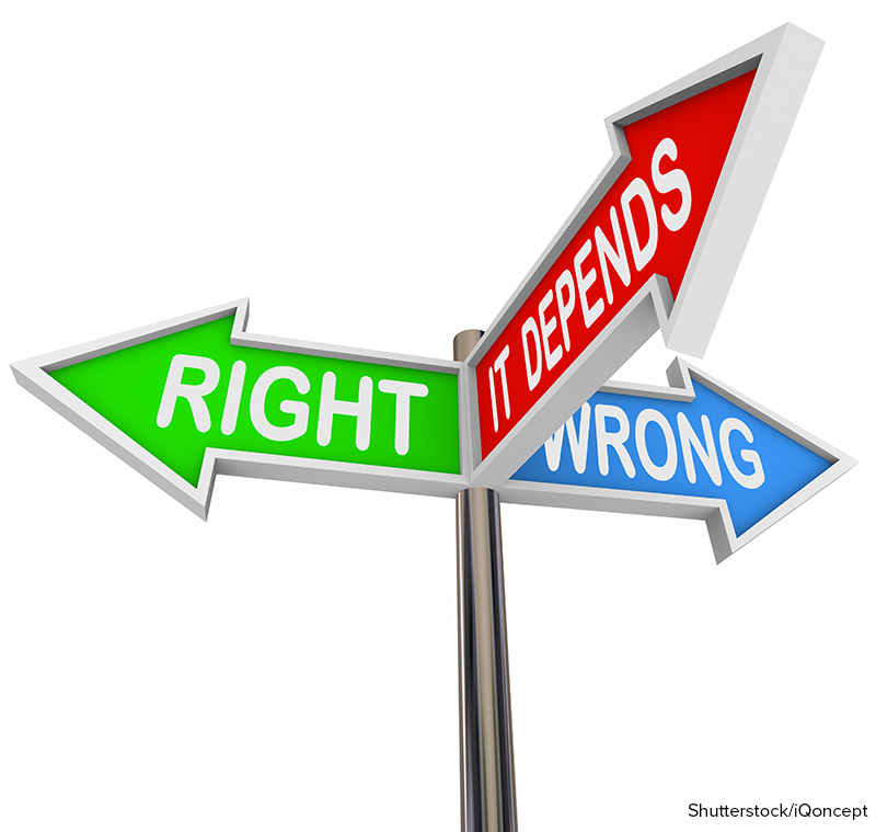 Three colorful arrow signs reading Right, Wrong and It Depends, illustrating the difficulty in choosing between two opposite scenarios when a middle ground is needed depending on the situation