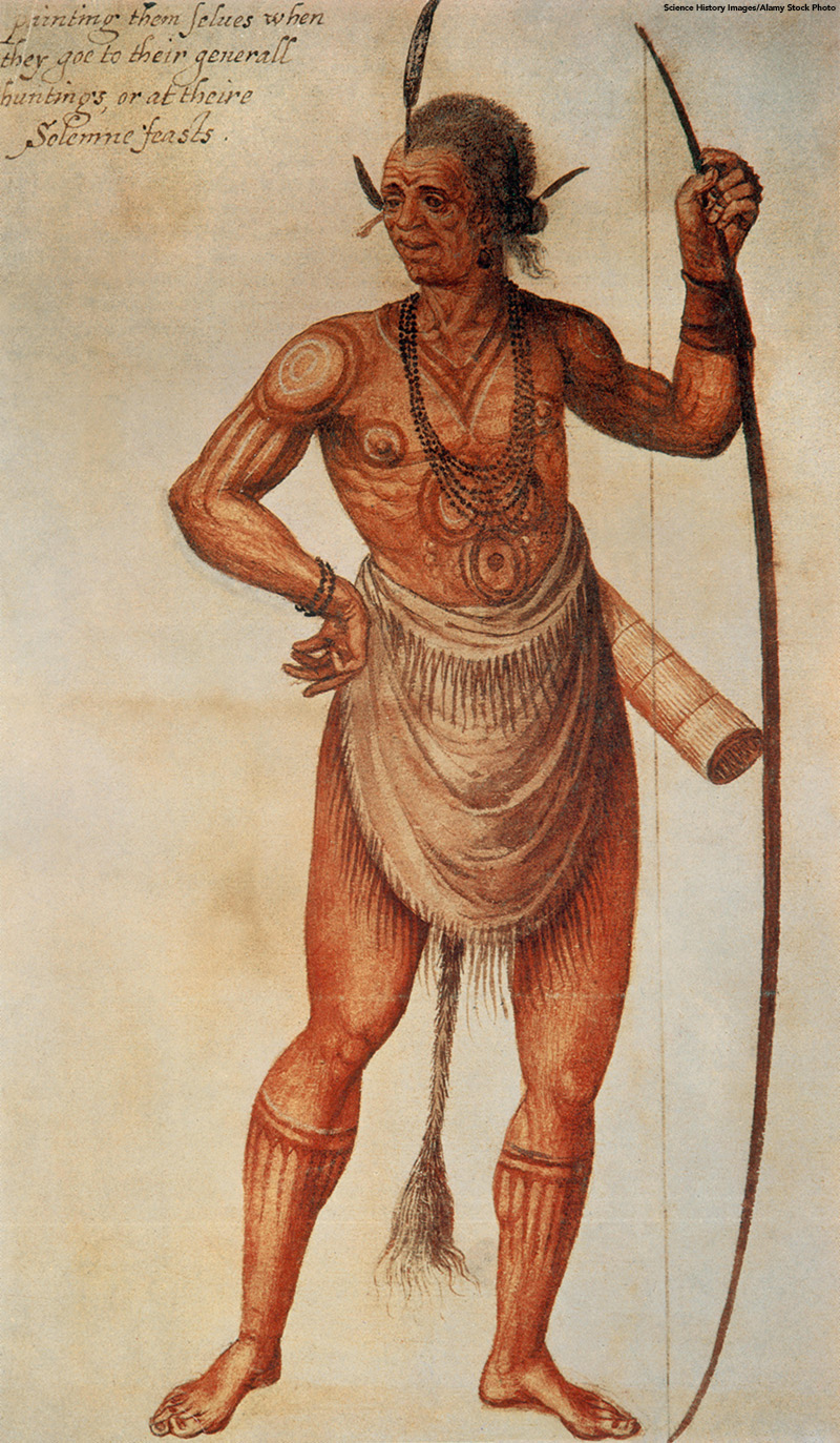 Watercolor by John White of a Native American man, entitled The manner of their attire and painting them selves, from sometime between 1585 and 1593. White made these watercolors on voyages to Virginia (now North Carolina) in the 1580s.